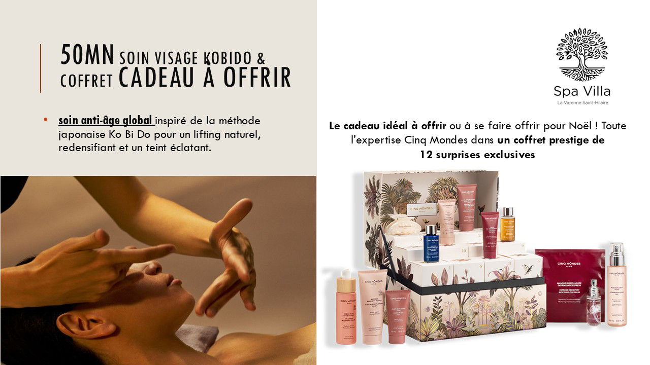 Le cadeau idéal à offrir ou à se faire offrir ! Toute l'expertise Cinq Mondes dans un coffret prestige de 12 surprises exclusives déclinées en formats voyage et revente, et sublimée par un accessoire inédit conçu spécialement pour cette collection des pharmacopées et d'un soin anti-âge global de 50mn inspiré de la méthode japonaise Ko Bi Do pour un lifting naturel, redensifiant et un teint éclatant. Ce que comprend ce Coffret: - Coffret prestige Cinq mondes - Soin Visage Anti-âge Kobido 50mn