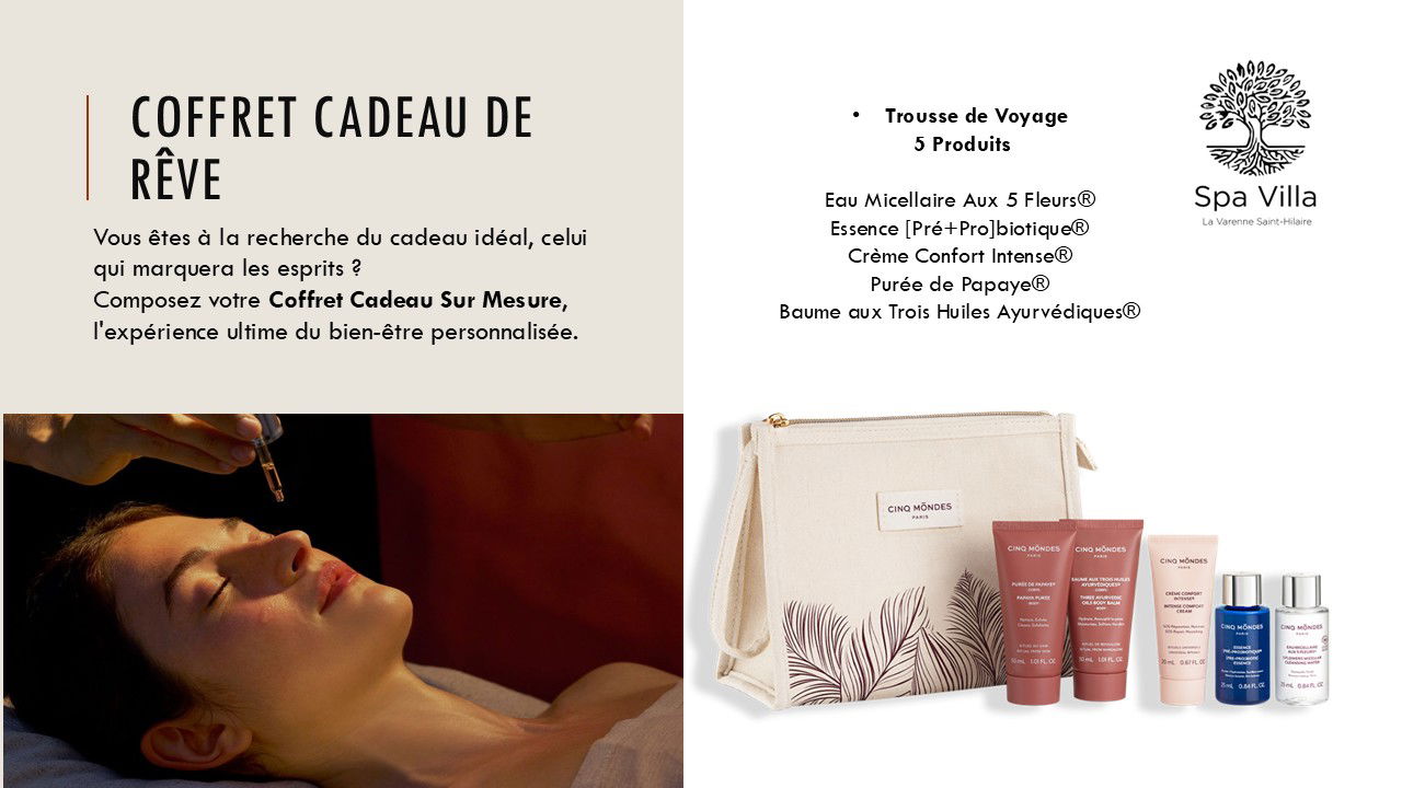Le cadeau idéal à offrir ou à se faire offrir ! Cinq Mondes a imaginé pour vous une trousse visage et corps avec les essentiels à emporter facilement ! Cette trousse contient : Une Eau Micellaire aux 5 Fleurs® 25mL, une Essence [Pré+Pro]biotique® 25mL, une Crème Confort Intense® 20mL, une Purée de Papaye® 30mL et un Baume aux Trois Huiles® 30mL + Soin Visage Perfecteur Fruits et Fleur de Bali 80mn, Ce soin profond nettoie la peau, lisse le grain et ravive l’éclat du teint grâce à des ingrédients naturels et une gestuelle relaxante. Il commence par un diagnostic personnalisé suivi d’un nettoyage, d’une exfoliation douce et d’un masque adapté. Ce que comprend ce Coffret: - Trousses de Voyage cinq mondes - Soin Visage Perfecteur Fruits et Fleur de Bali 80mn
