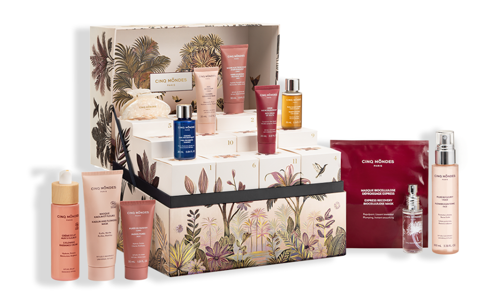 Toute l'expertise Cinq Mondes dans un calendrier de l'Avent de 12 surprises exclusives déclinées en formats voyage et revente, et sublimée par un accessoire inédit conçu spécialement pour cette collection des pharmacopées et d'un soin anti-âge global de 80mn inspiré de la méthode japonaise Ko Bi Do pour un lifting naturel, redensifiant et un teint éclatant.