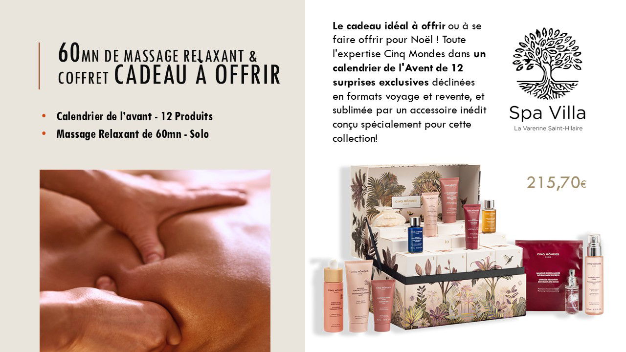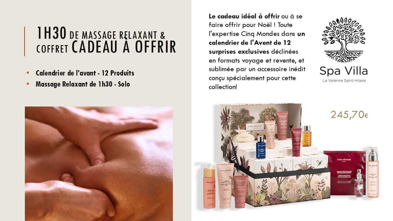 Toute l'expertise Cinq Mondes dans un calendrier de l'Avent de 12 surprises exclusives déclinées en formats voyage et revente, et sublimée par un accessoire inédit conçu spécialement pour cette collection des pharmacopées et d'un massage Relaxant de 1h30